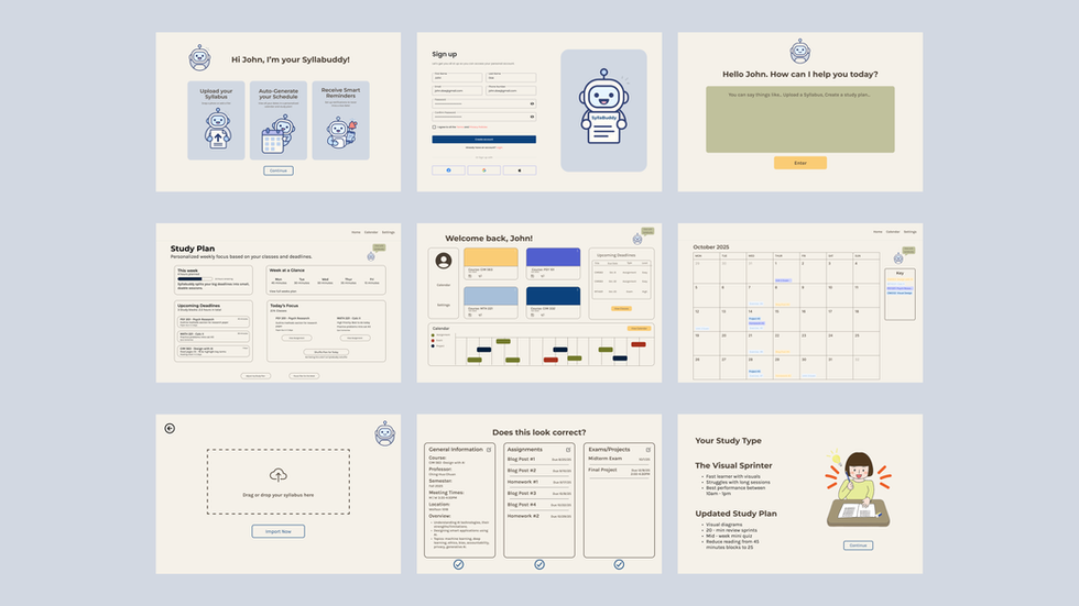 This prototyped app was created to help students manage their courses, syllabi, assignments, and plan their semester in an organized way. Throughout the semester, files and paperwork can get misplaced, assignments can be forgotten about, and exams can sneak up on you. Syllabuddy acts as a central hub for tracking when assignments are due, when to start studying, and it can shape a clear academic plan for students.