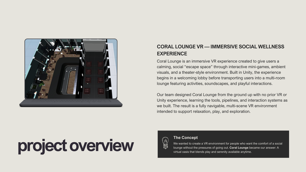 Coral Lounge is an immersive virtual reality social space designed to give users a calming escape without leaving home. Built in Unity, the experience guides users throughout the fully interactive lounge featuring a theater and playful mini-games. Our goal was to reimagine what digital relaxation can feel like creating a cozy, low-pressure environment for people who may not want to go out, can’t due to weather or cost, or simply need a peaceful place to unwind.